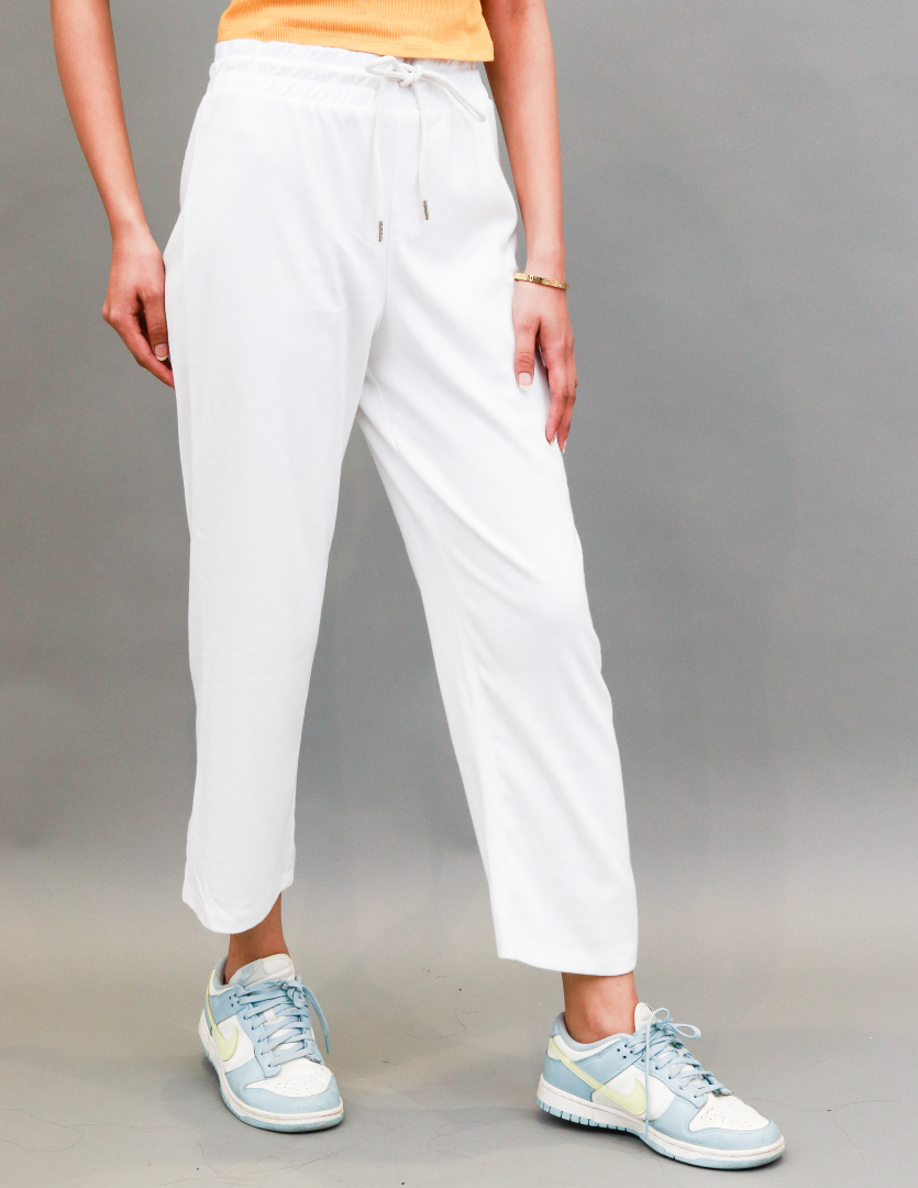 A pair of White solid woven wide leg Trouser has a partially elasticated waistband, drawstring closure. Our range is well-known for its unique features like durability, comfort and excellent fit. Made of 96% Cotton, 5% Elastane