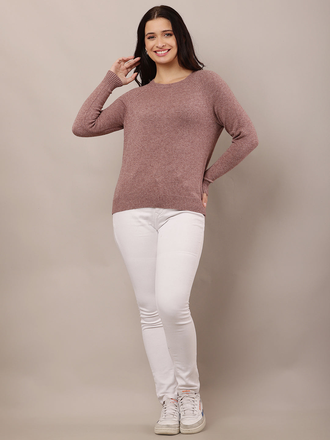 Exude elegance with our Women's Wine Round Neck Full-Sleeve Polyester Sweater, a perfect blend of sophistication and comfort for cooler days.