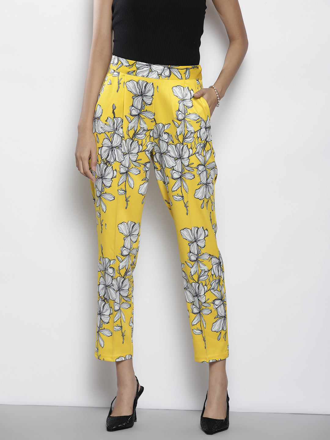 Women Yellow Floral Scuba Straight Pants