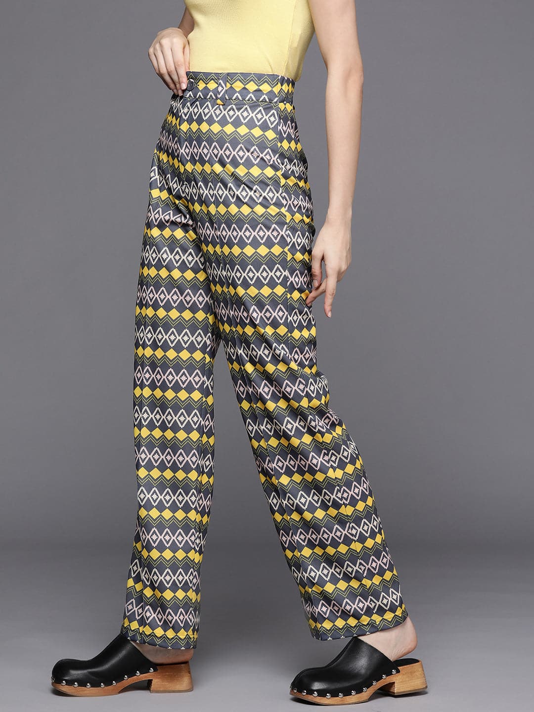 Yellow Geometric Print Straight Pants, In Karera Fabric, Unlined, Full Length, Regular Fit, Button Closure, Straight Hemline And Features Button Closure.