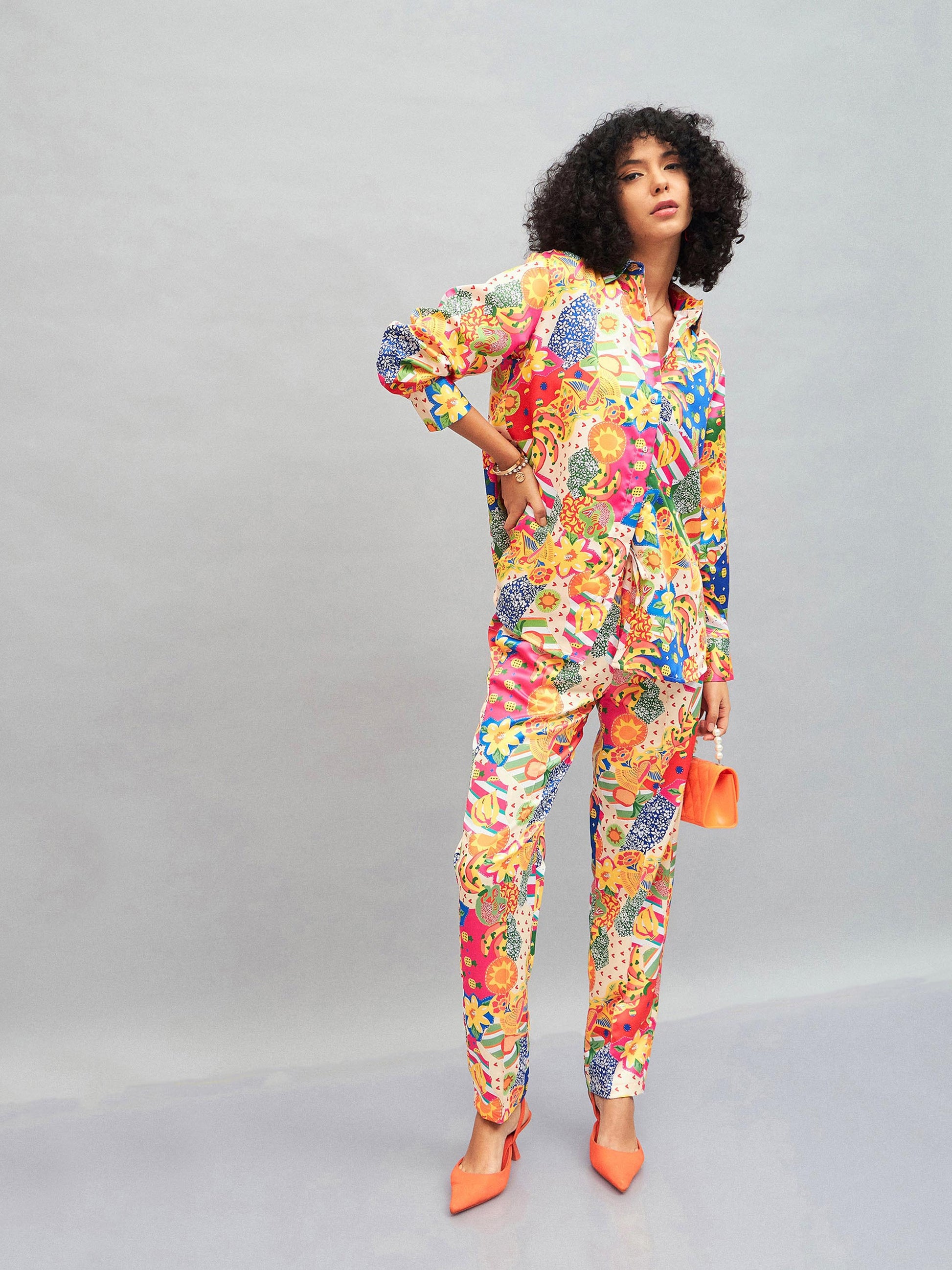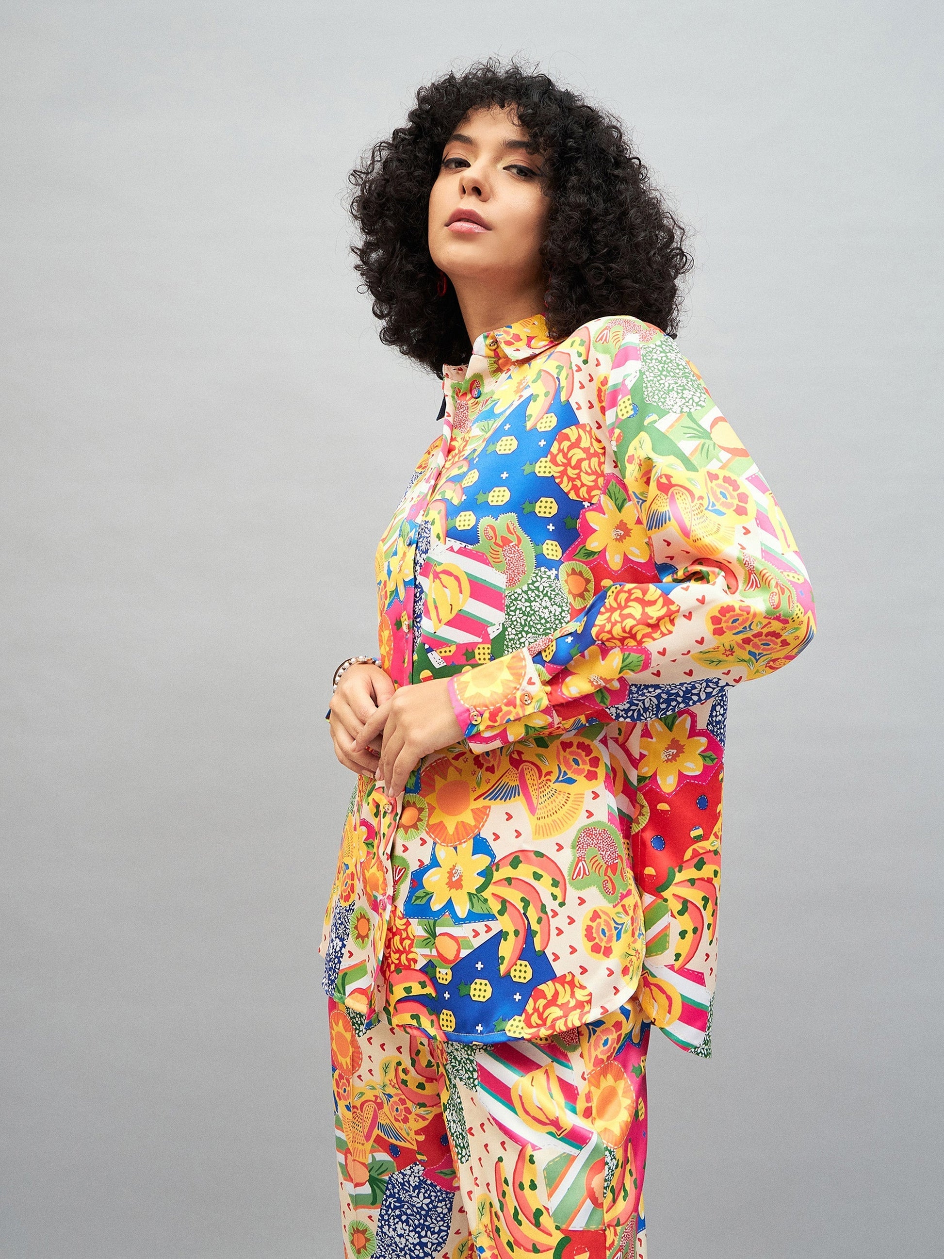 Women Yellow Multi Satin Abstract Oversized Shirt