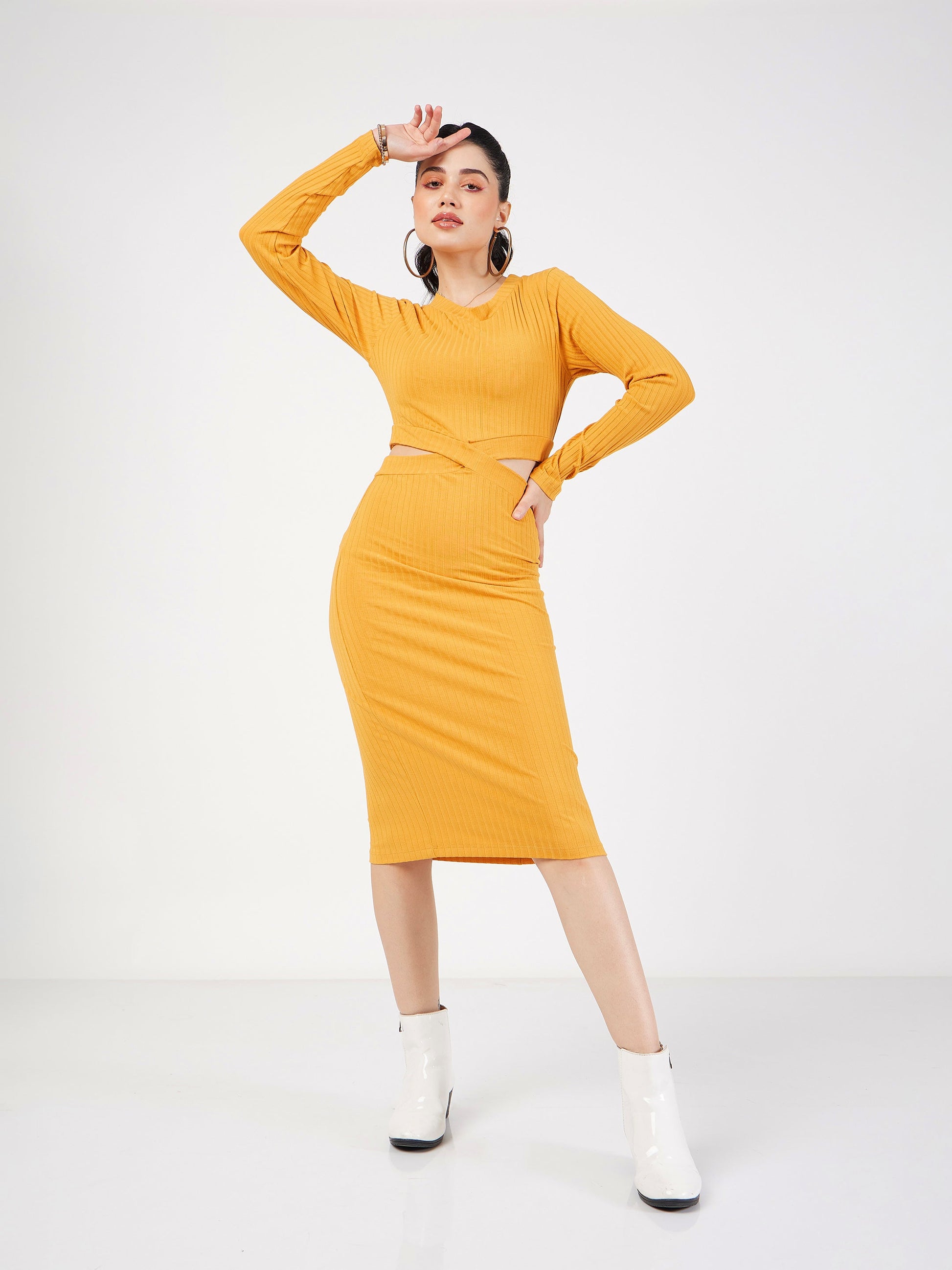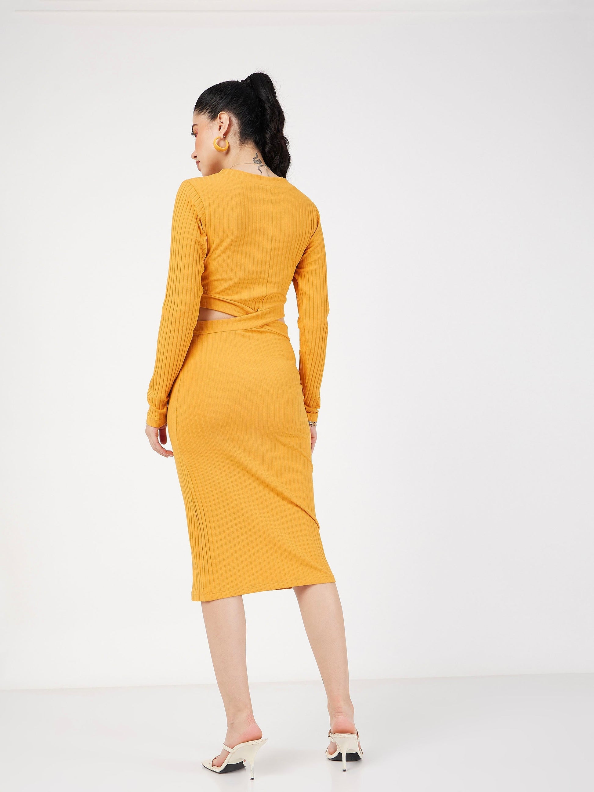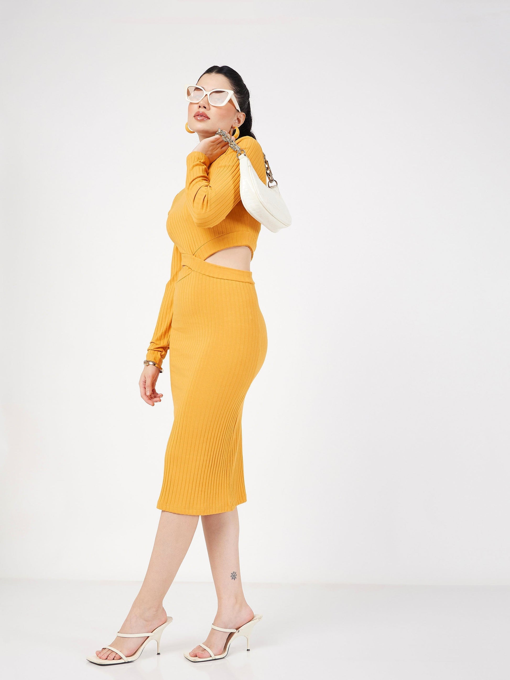 Yellow Rib Side Cut-Out Midi Dress, A Yellow Ribbed Midi Dress With Side Cut-Out Detail, Slim Fit, And Self-Ribbed Design.