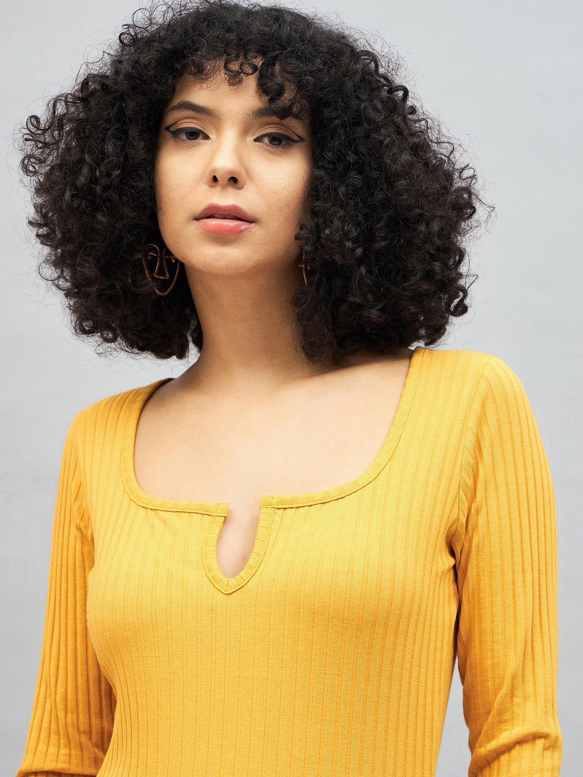 Yellow Rib V-Neck Top, In Rib Fabric, Unlined, Regular Length, Slim Fit, No Closure, Straight Hemline And Features Button At Front