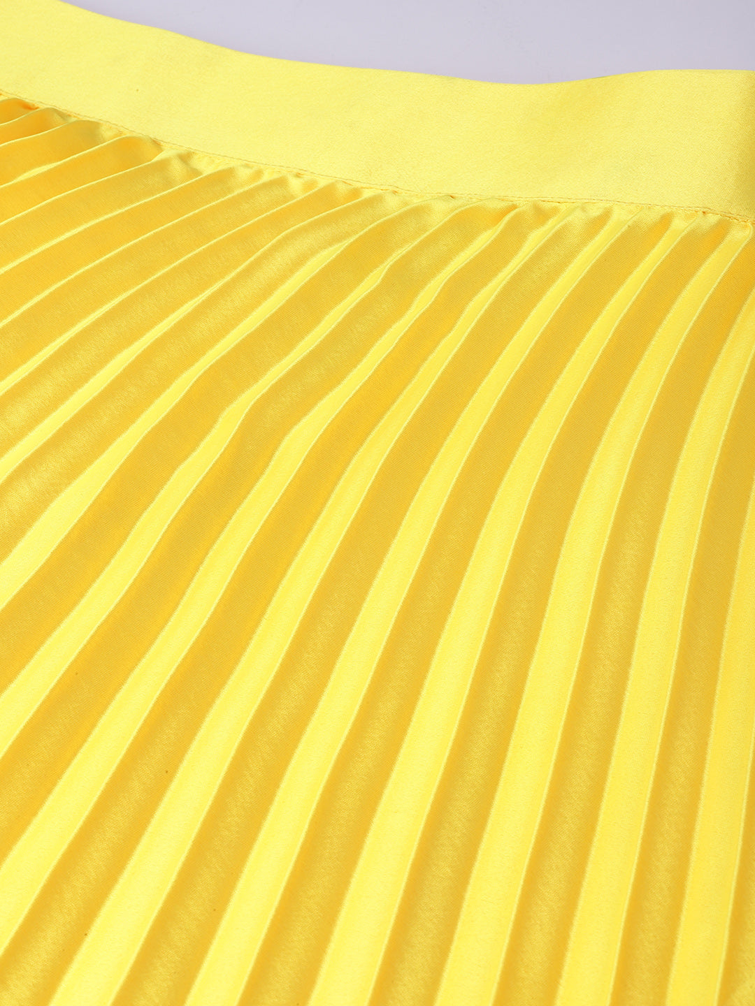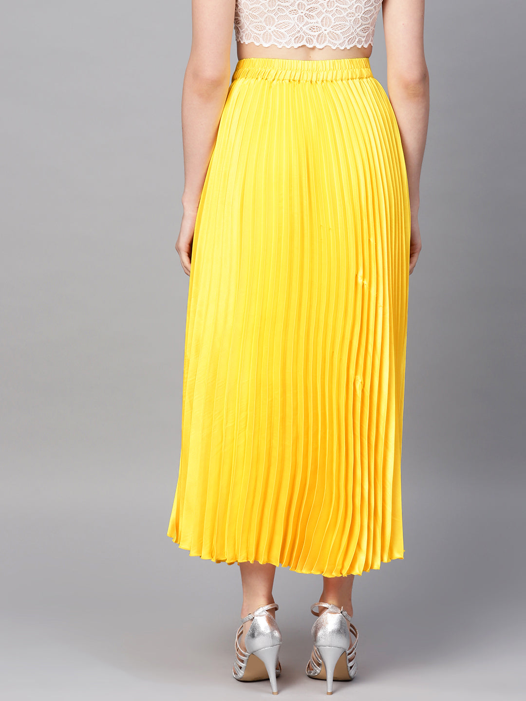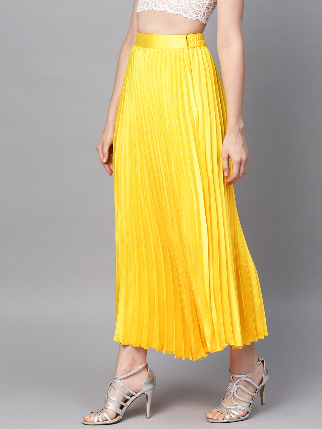 Yellow Satin Pleated Maxi Skirt, In Satin Fabric, Polyester Lining, Full Length, Comfort Fit, Zipper Closure, Flared Hemline And Features Pleated Maxi Skirt.
